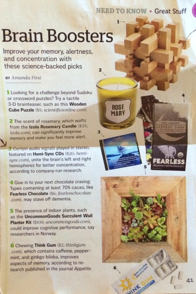 In which Amanda First of Prevention Magazine says that my album Indigo for Quantum Focus with Hemi-Sync® is a better brain booster than chocolate, but perhaps not quite as effective as an Izola Rosemary Candle. Or at least the list implies as much…